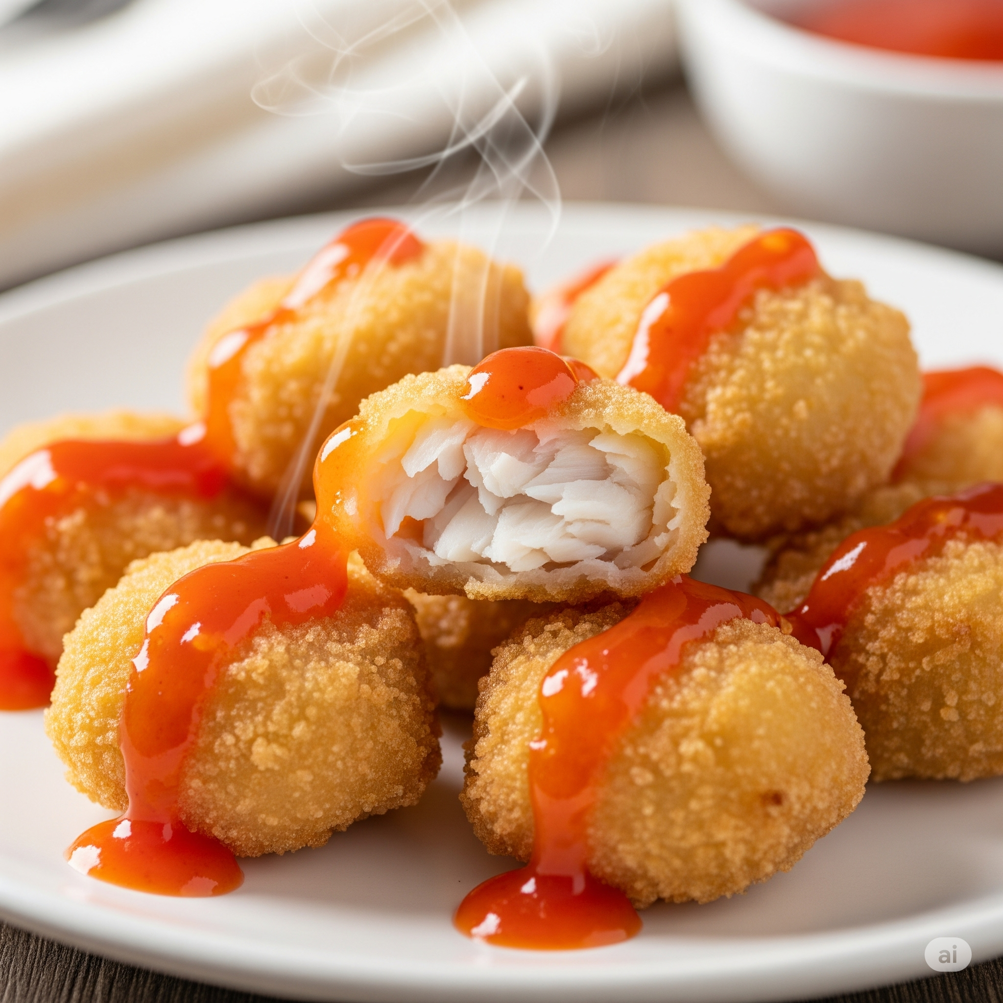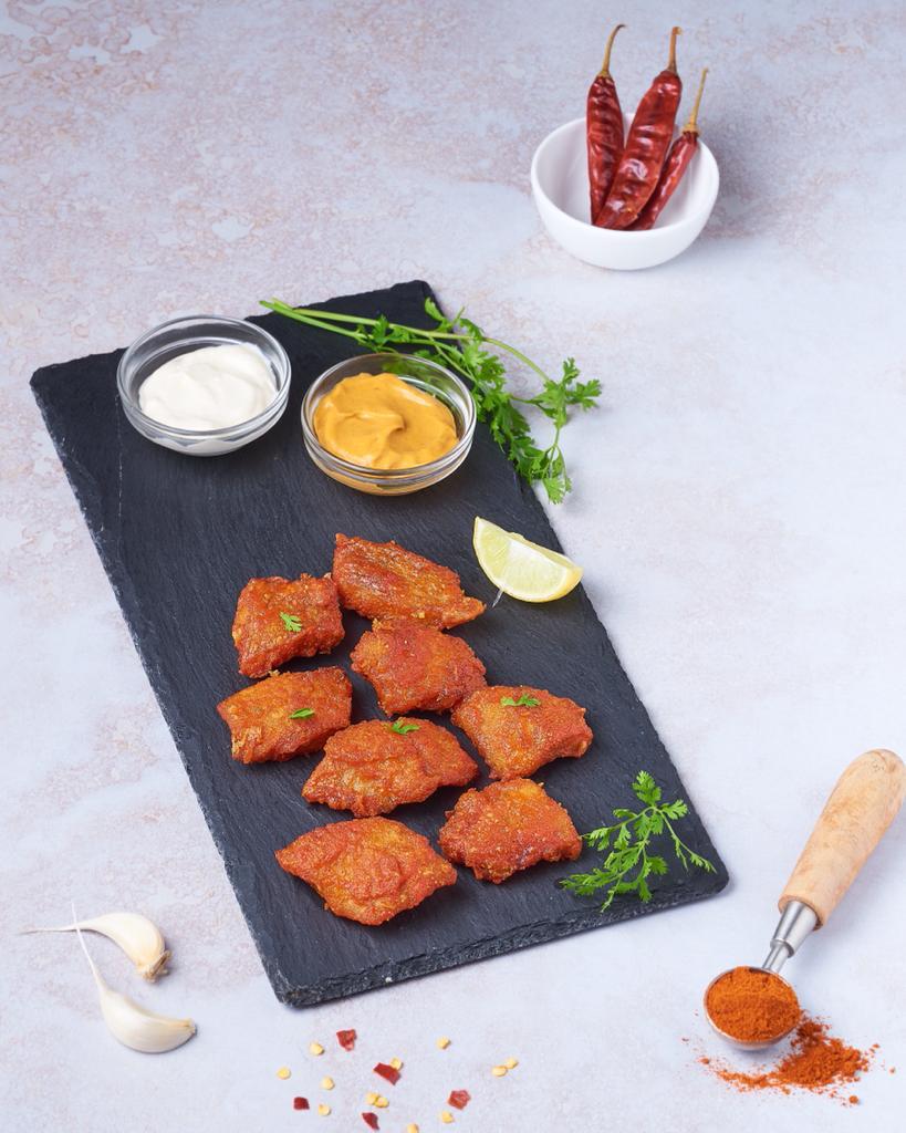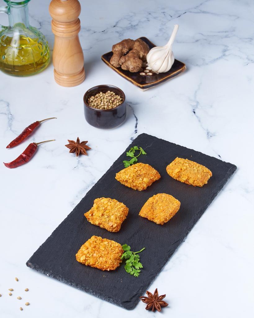Bite-sized white fish pieces marinated with increasing spice levels. Breaded coating imparts crunchiness—great for frying, air‑fryer use, or oven baking.