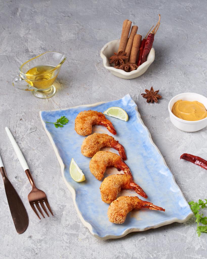 Elongated, torpedo-shaped prawns coated in spicy Indian masala. Deep-fried or air-fried, they offer a crunchy outer bite with a juicy centre.